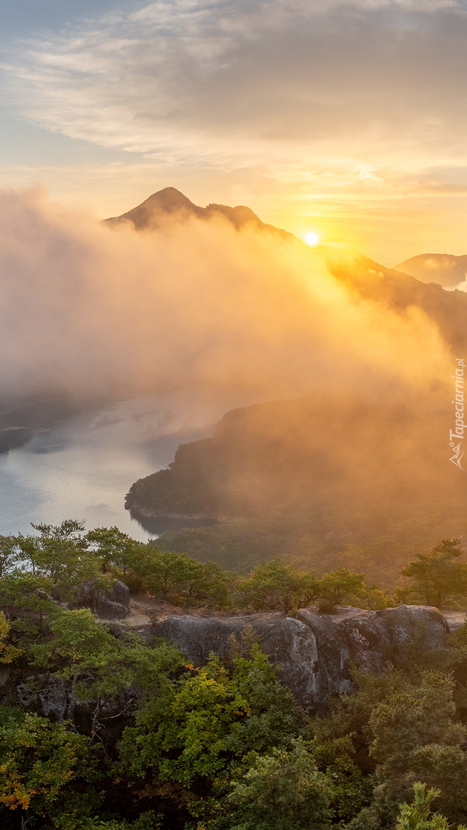 Edytor tapety: Mgła nad jeziorem w górach