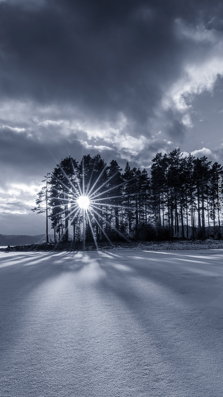 Edytor tapety: Promienie słońca wśród zimowych drzew