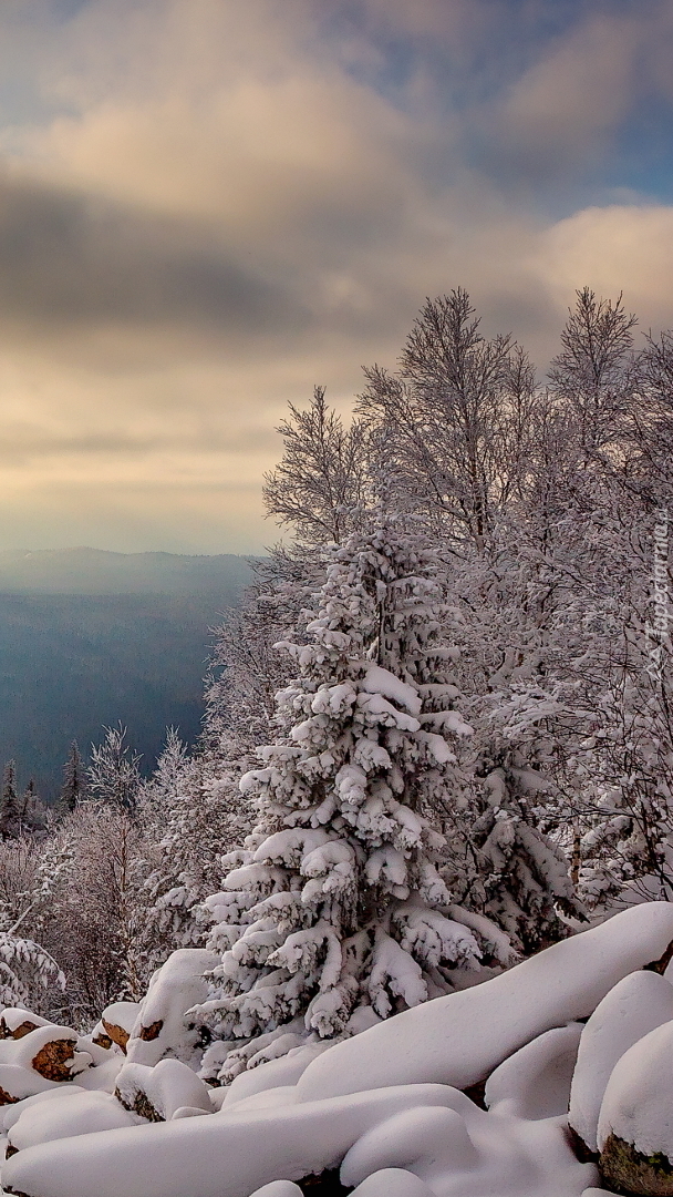 Edytor tapety: Drzewa i kamienie pokryte śniegiem