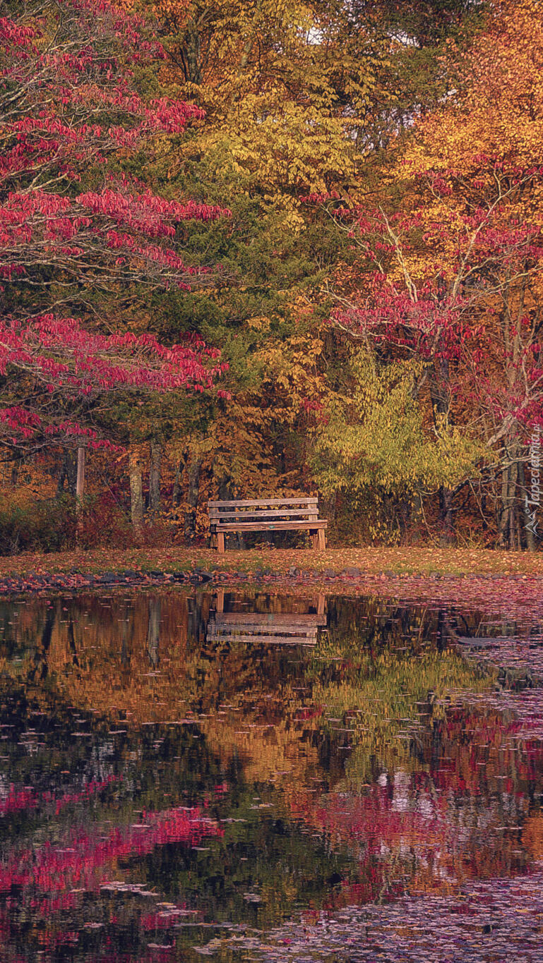 Edytor tapety: Jesienny park z ławką przy stawie