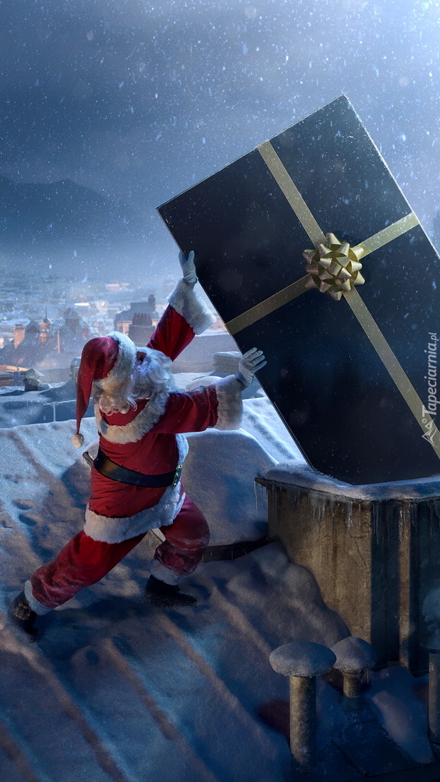 Edytor tapety: Mikołaj z prezentem na dachu