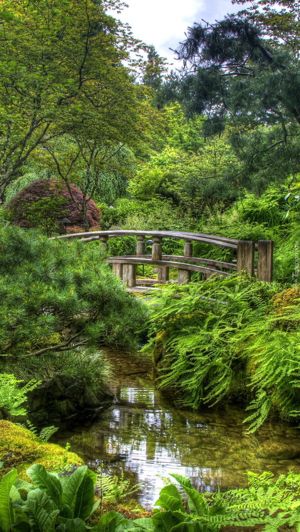 Edytor tapety: Mostek nad rzeką w ogrodzie