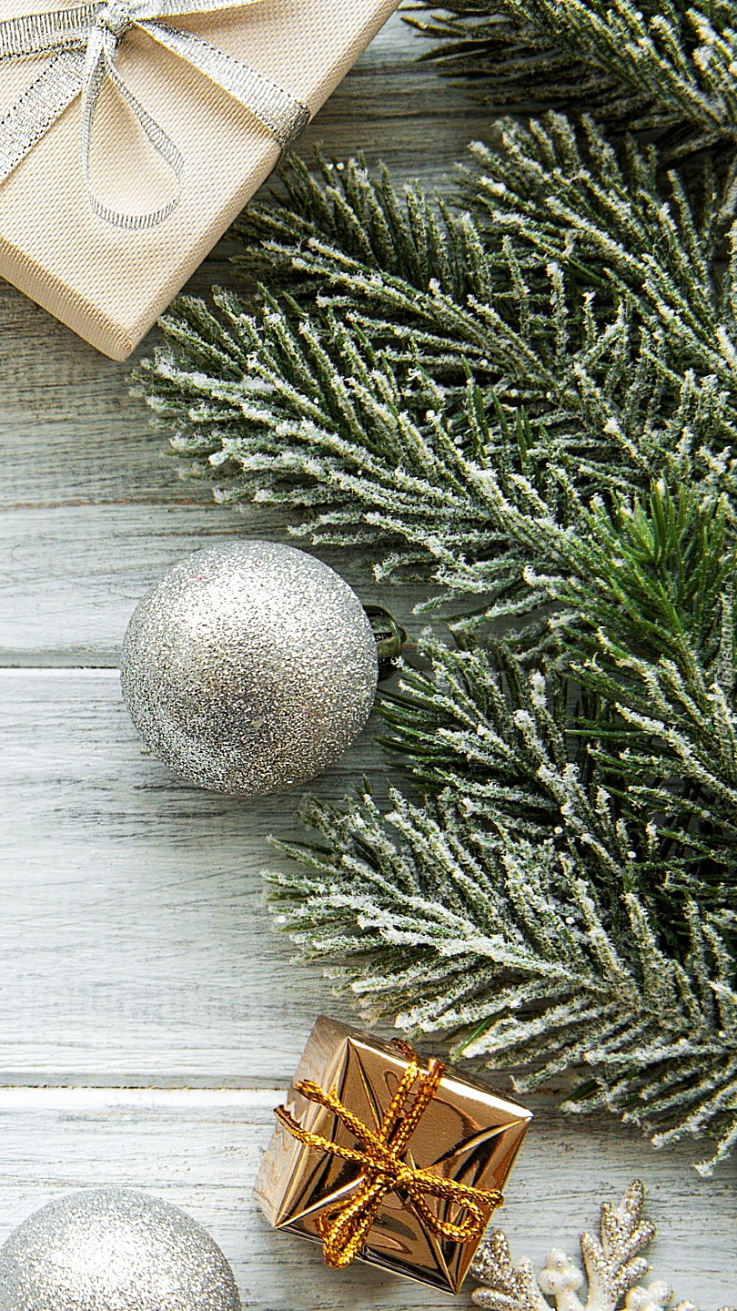 Edytor tapety: Bombki i prezenty obok gałązek