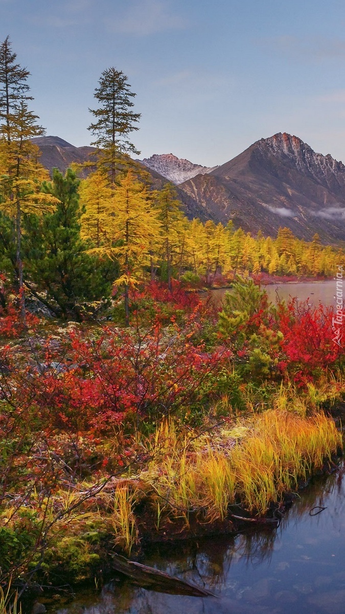 Edytor tapety: Jesienna kolorowa roślinność nad jeziorem Nevidimka