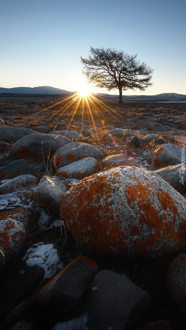Edytor tapety: Drzewo i kamienie w promieniach słońca