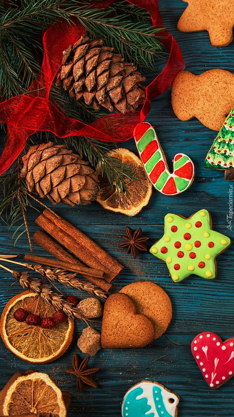 Edytor tapety: Szyszki na gałązce obok ciasteczek