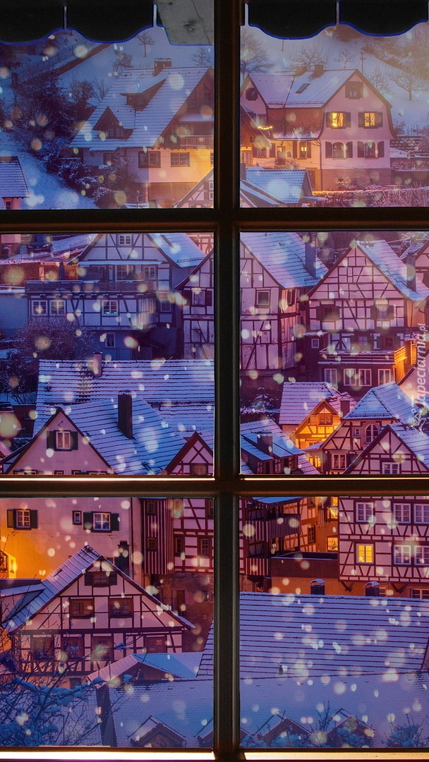 Edytor tapety: Widok z okna na zaśnieżone miasteczko