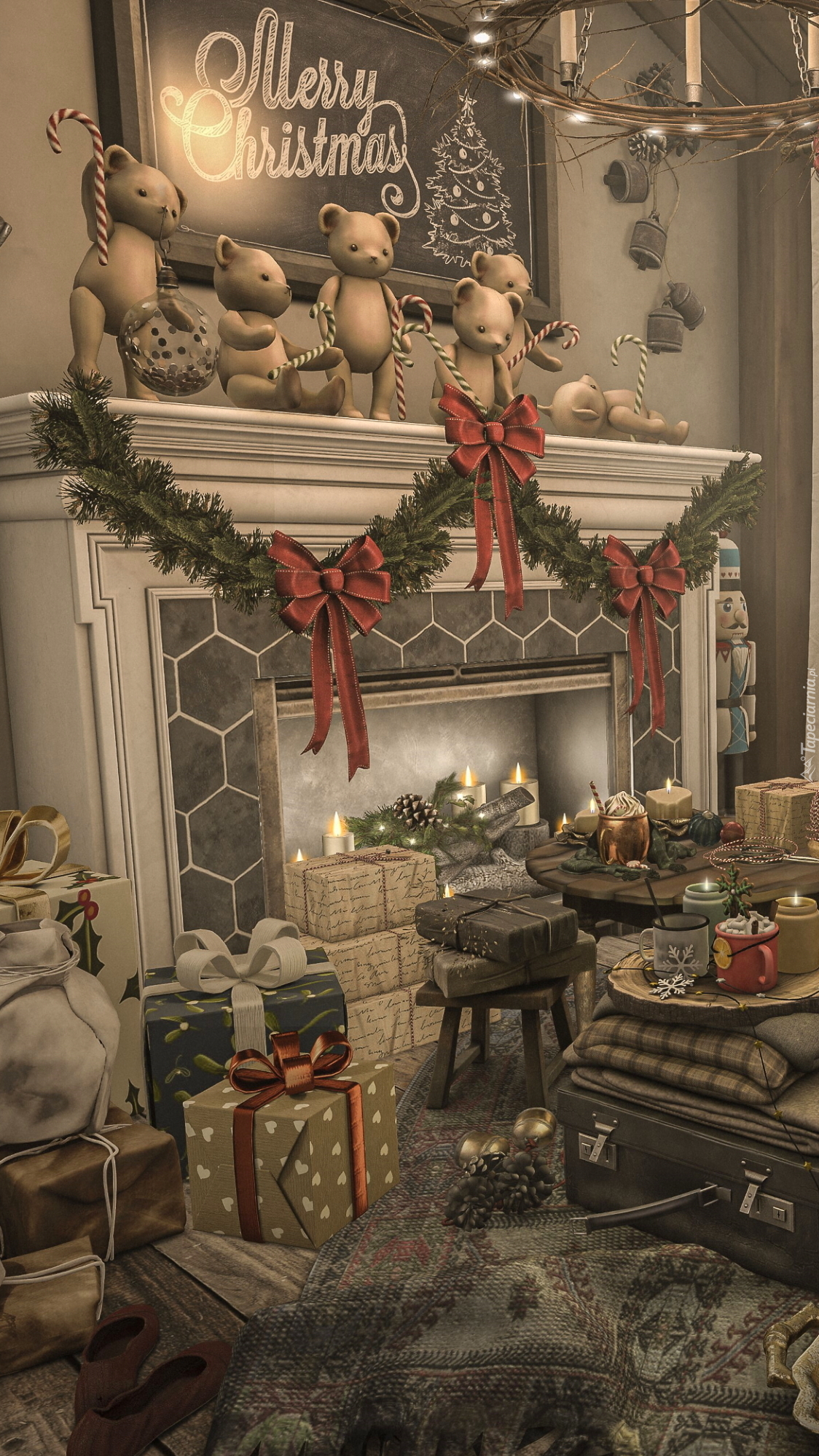 Edytor tapety: Prezenty obok kominka ze świąteczną girlandą