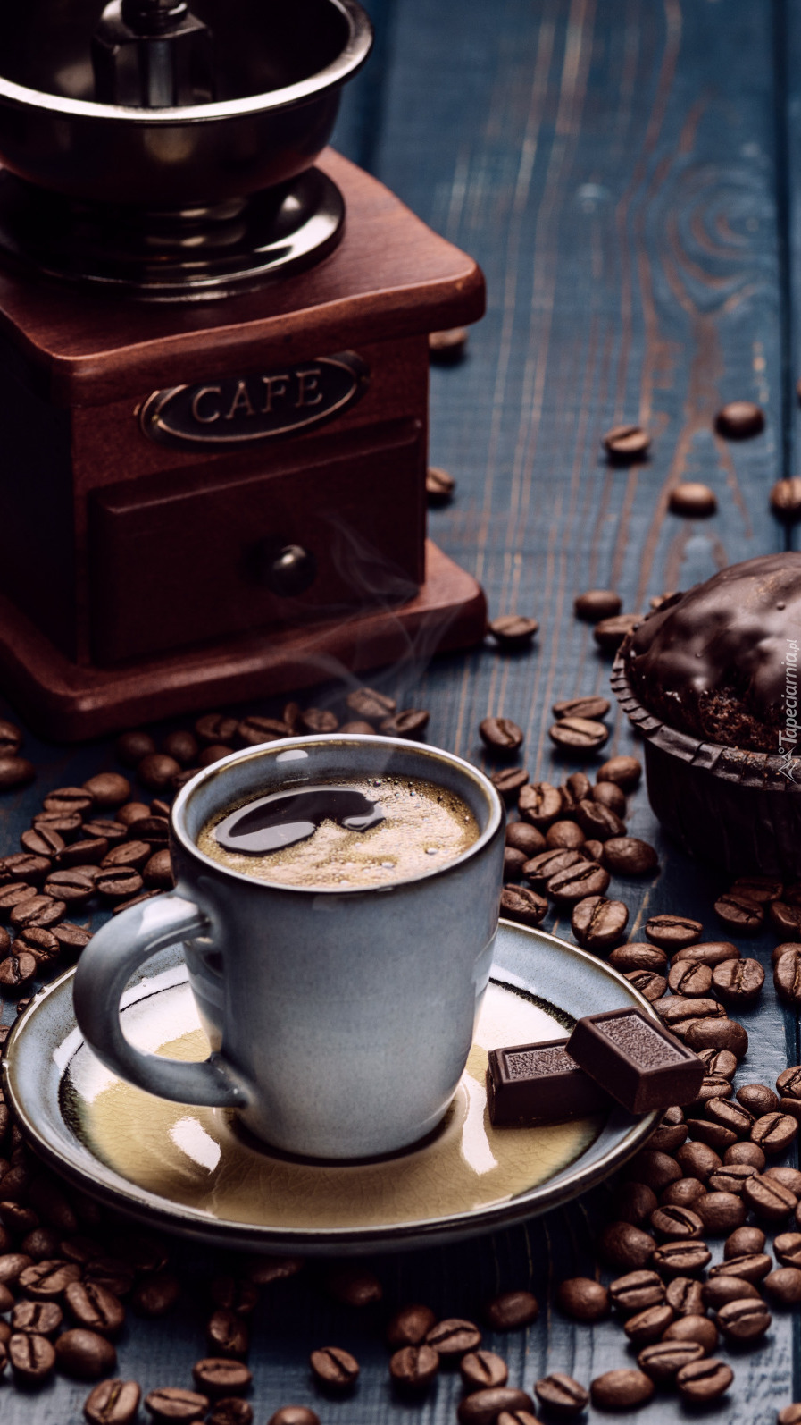 Edytor tapety: Filiżanka kawy obok młyna