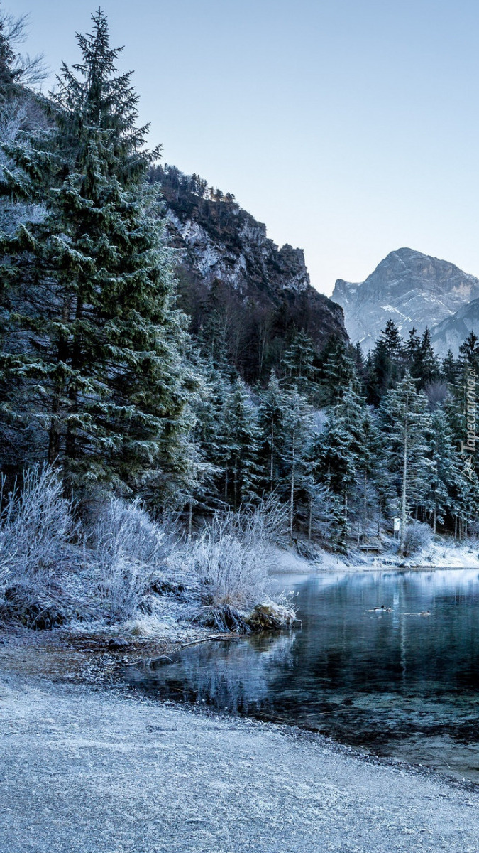 Edytor tapety: Oszronione świerki na brzegu jeziora