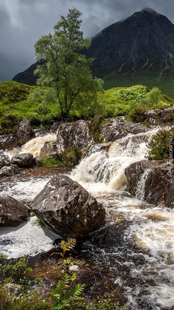 Edytor tapety: Kamienie w rzece na tle gór