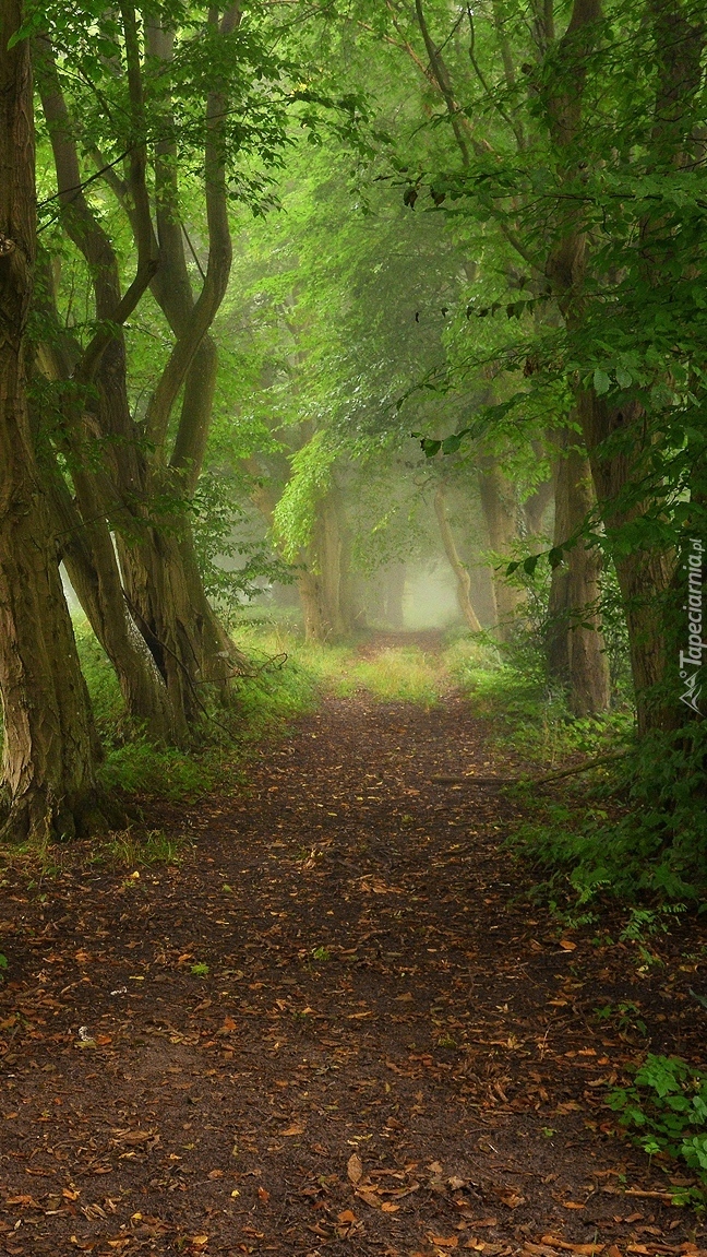 Edytor tapety: Zielone drzewa przy zamglonej drodze