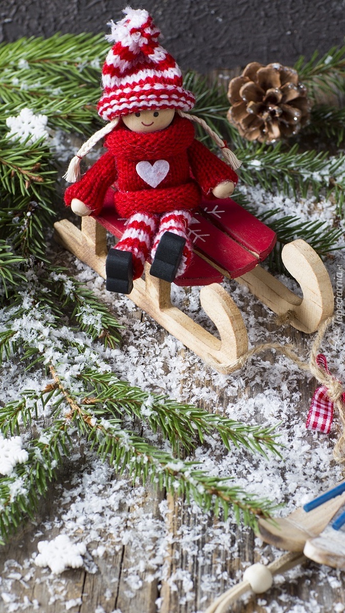 Edytor tapety: Laleczka na sankach wśród gałązek