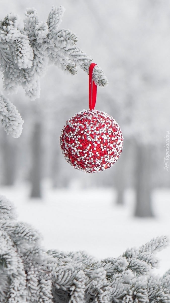 Edytor tapety: Czerwona bombka na ośnieżonej gałązce