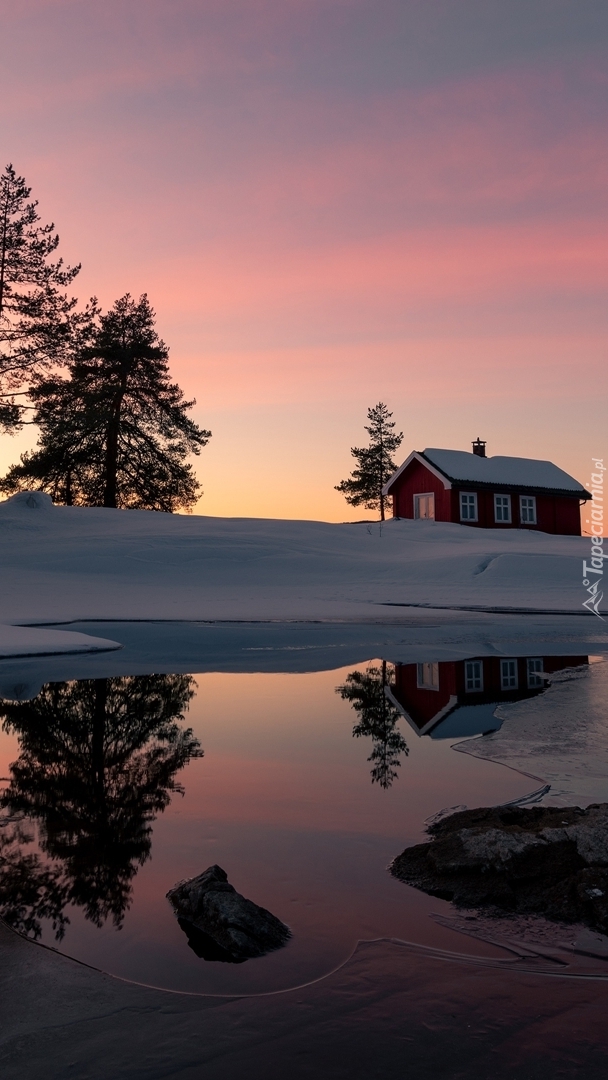 Edytor tapety: Dom w śniegu nad jeziorem Vaeleren