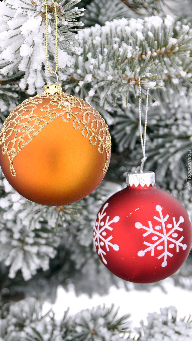 Edytor tapety: Dwie bombki na ośnieżonych gałązkach