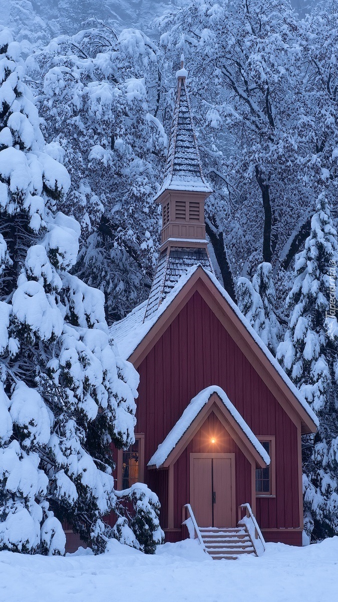Edytor tapety: Kapliczka pod ośnieżonymi drzewami