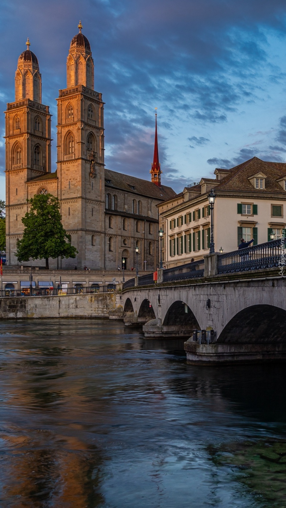 Edytor tapety: Kościół Grossmunster nad rzeką Limmat