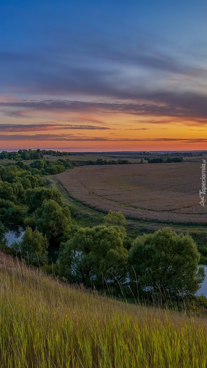 Edytor tapety: Drzewa nad rzeką okalającą pola