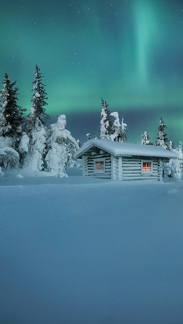 Edytor tapety: Zasypany śniegiem domek pod lasem
