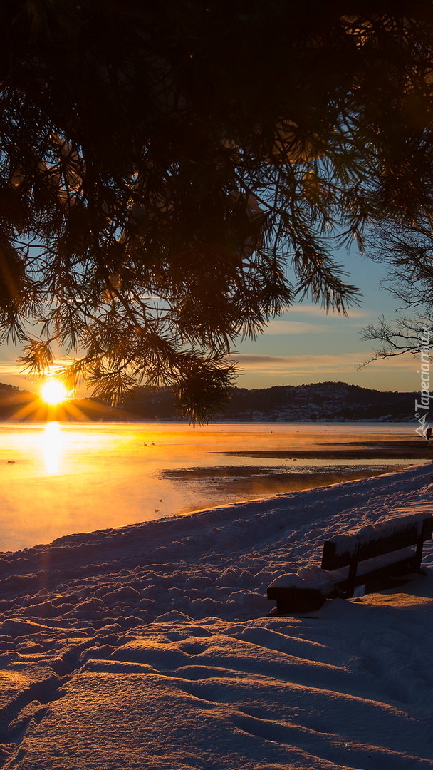 Edytor tapety: Ośnieżona ławeczka nad fiordem Topodalsfjorden
