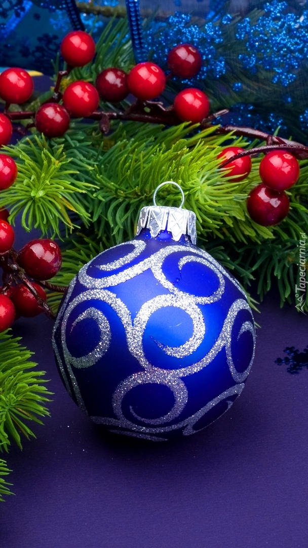 Edytor tapety: Niebieska bombka obok zielonych gałązek