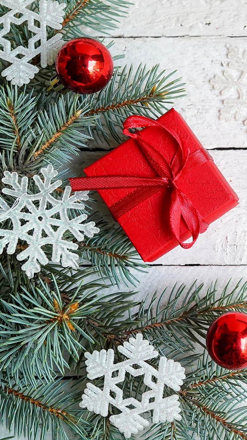 Edytor tapety: Śnieżynki i prezent na gałązkach