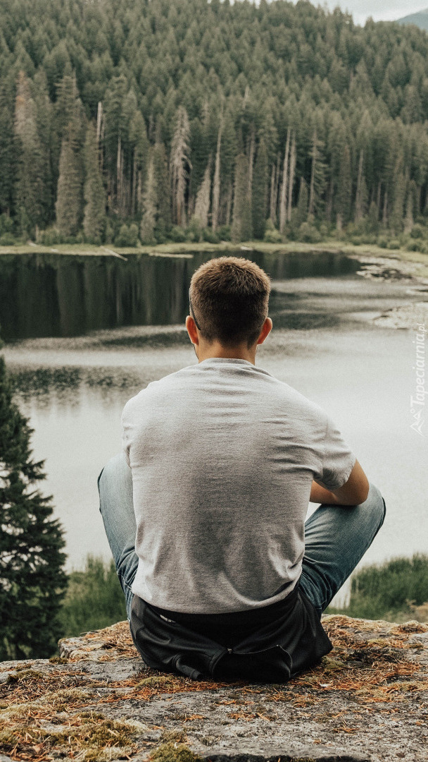 Edytor tapety: Mężczyzna na skale nad jeziorem