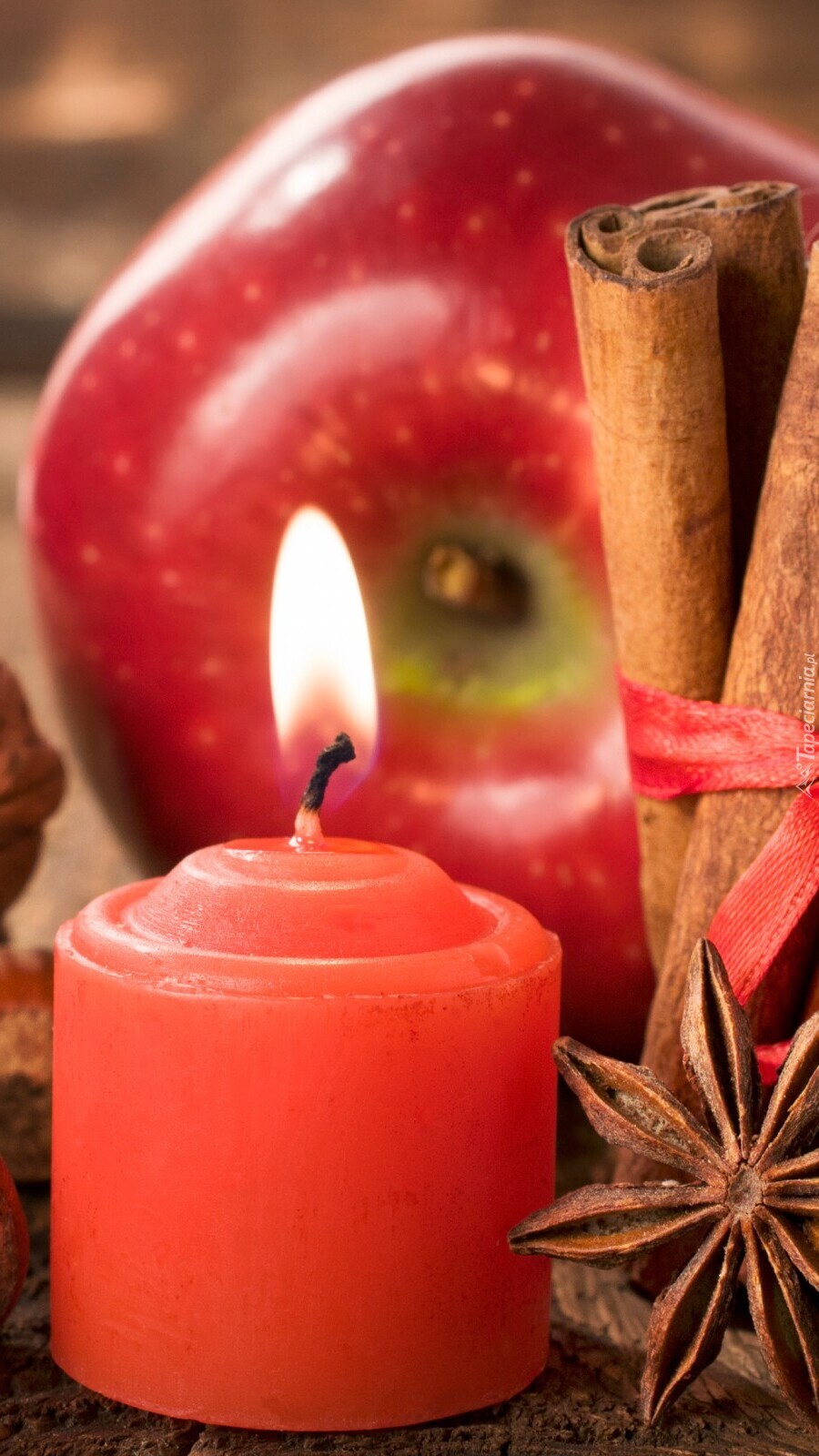 Edytor tapety: Świeczka obok jabłka i cynamonu