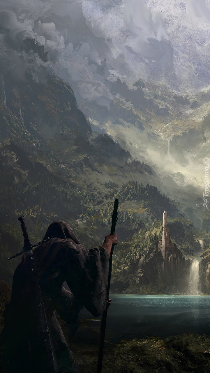 Edytor tapety: Wędrowiec stojący przy brzegu jeziora