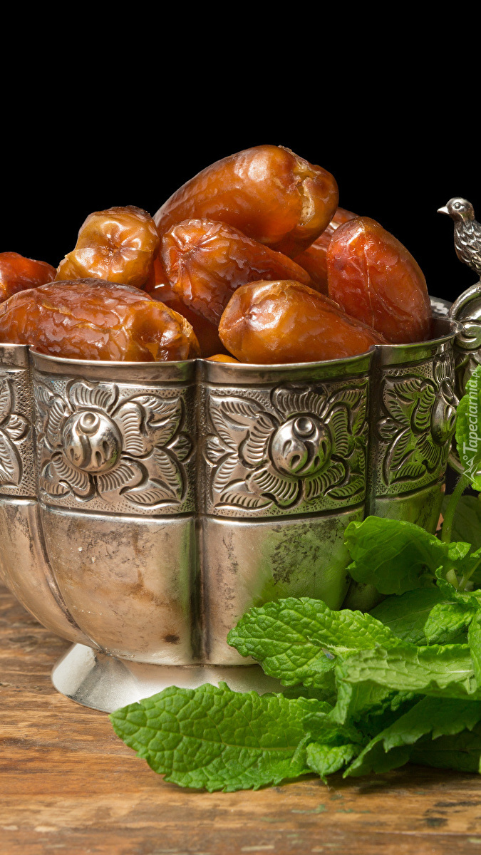 Edytor tapety: Srebrna miseczka z daktylami