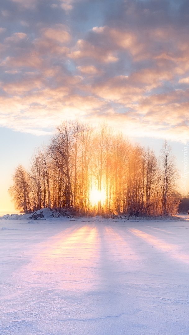 Edytor tapety: Słońce wśród drzew na zaśnieżonym polu