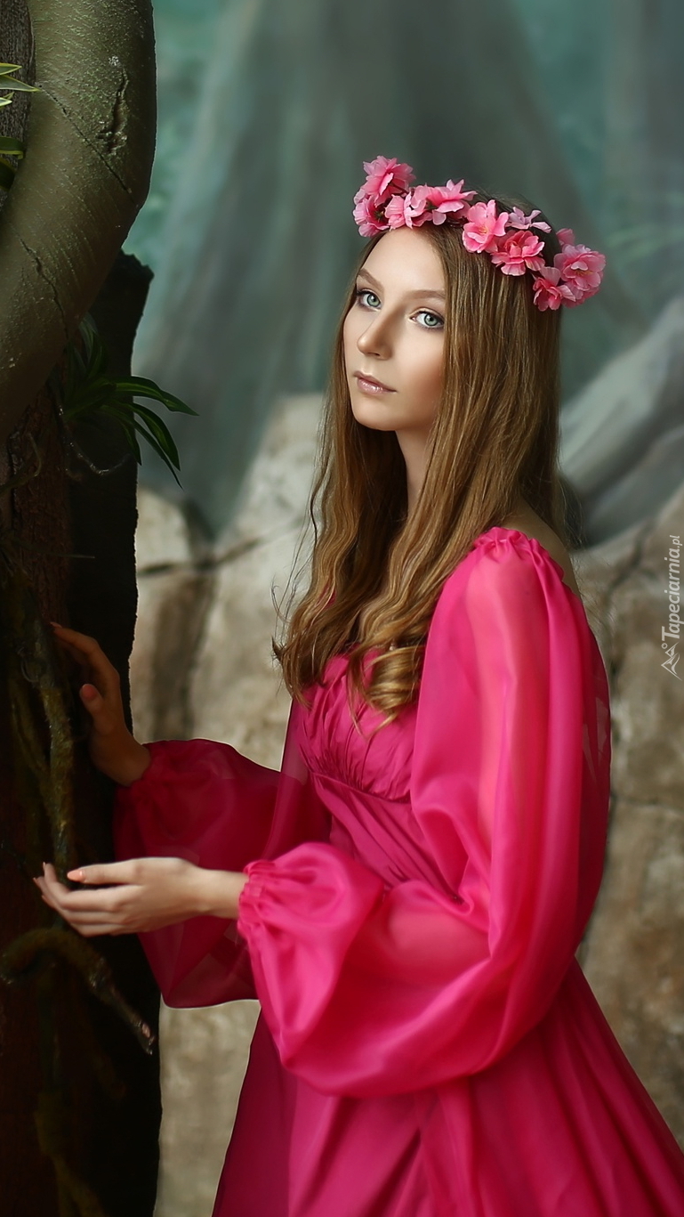 Edytor tapety: Kobieta w wianku i różowej sukience