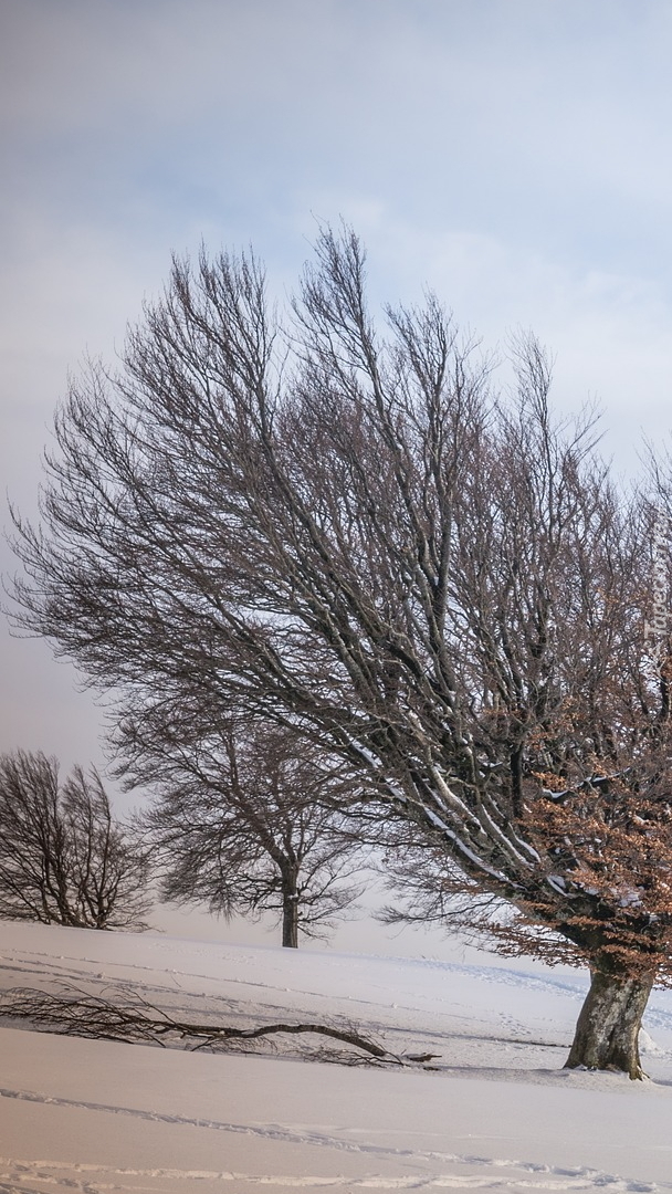 Edytor tapety: Ślady w śniegu pod drzewami