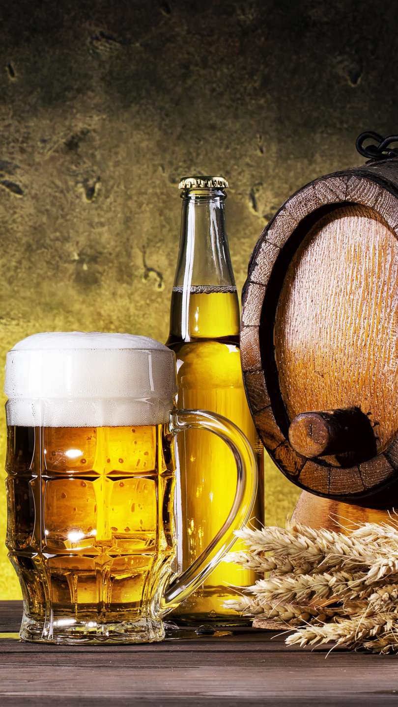 Edytor tapety: Kufel piwa obok butelki i beczki