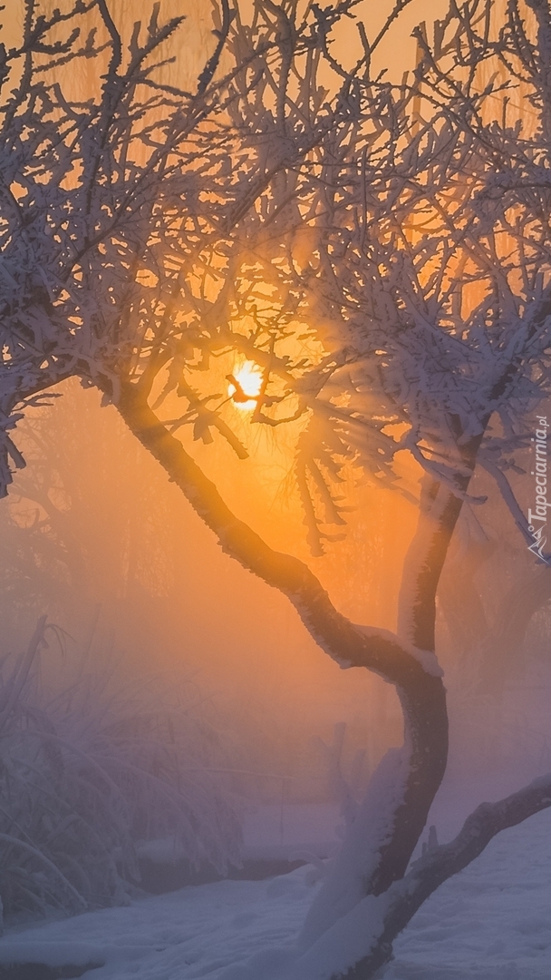 Edytor tapety: Zamglone słońce w ośnieżonych gałęziach