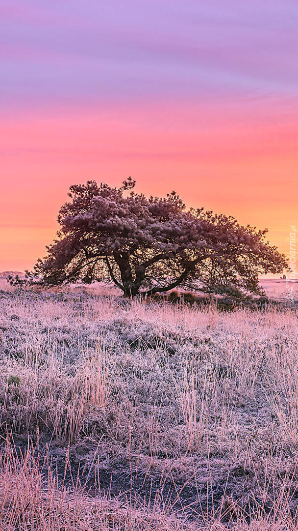 Edytor tapety: Rozłożyste drzewo na wrzosowisku