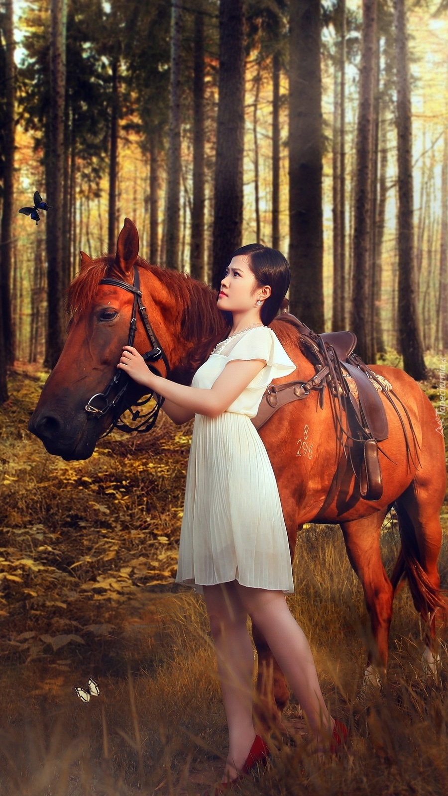 Edytor tapety: Spacer kobiety z koniem po lesie