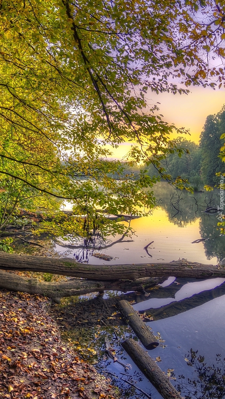 Edytor tapety: Kłody i pnie na brzegu rzeki