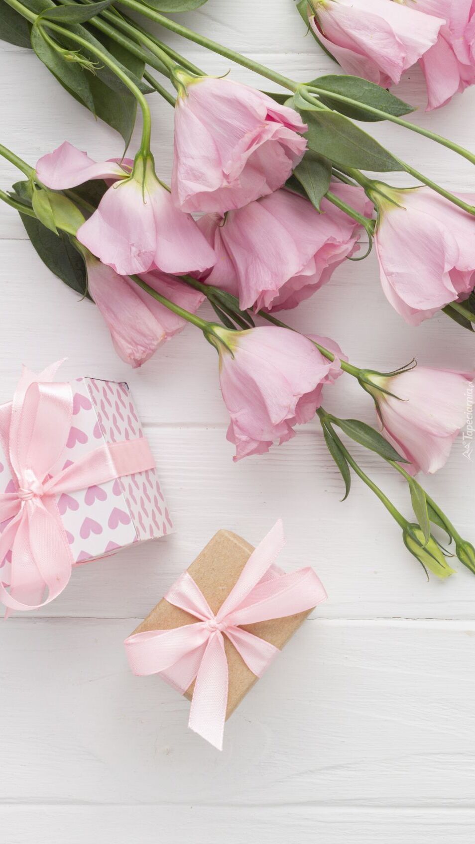 Edytor tapety: Kwiaty eustomy obok prezentów