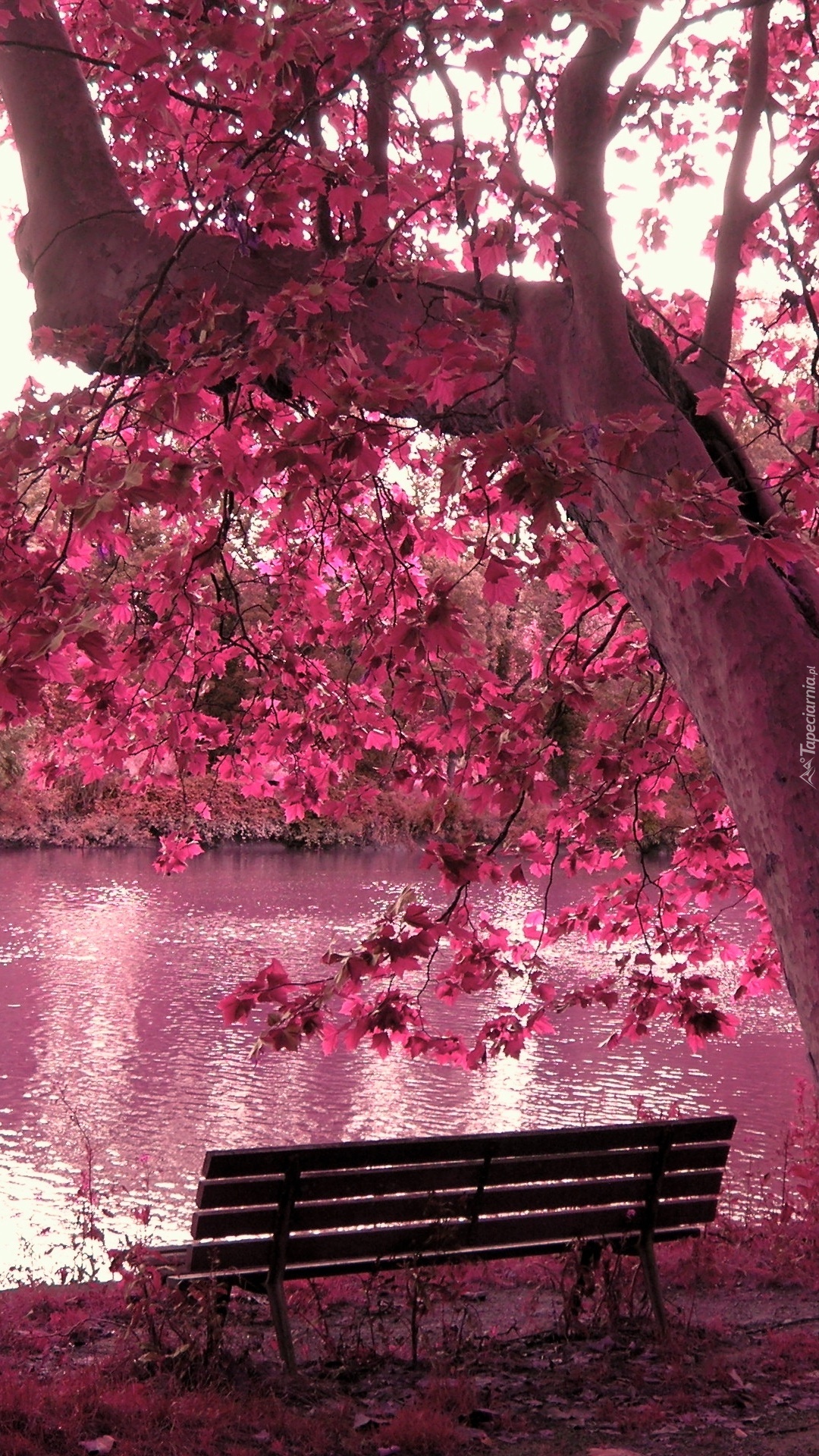 Edytor tapety: Ławka pod różowym drzewem