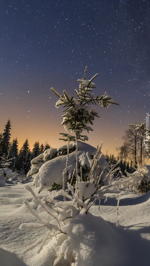 Edytor tapety: Gwiaździste niebo nad ośnieżonymi drzewami