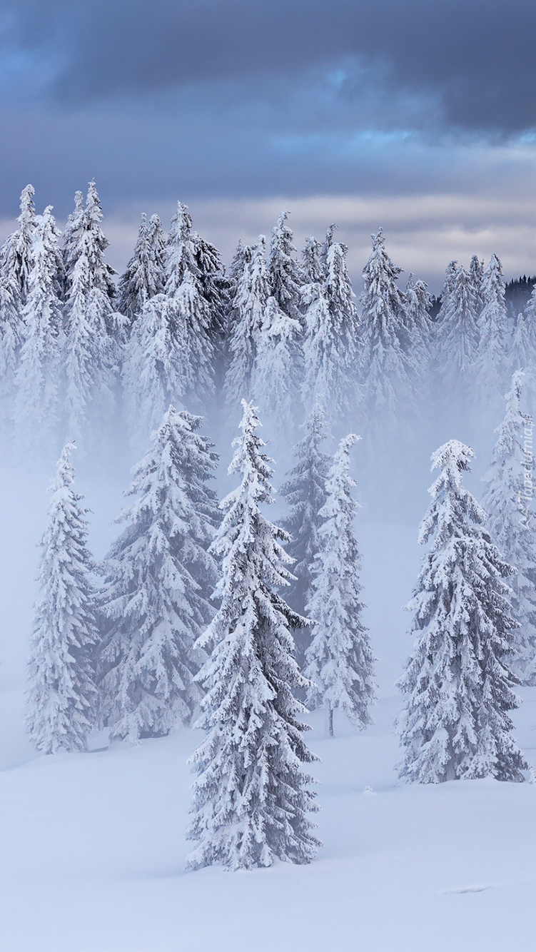 Edytor tapety: Zaśnieżone drzewa w lesie