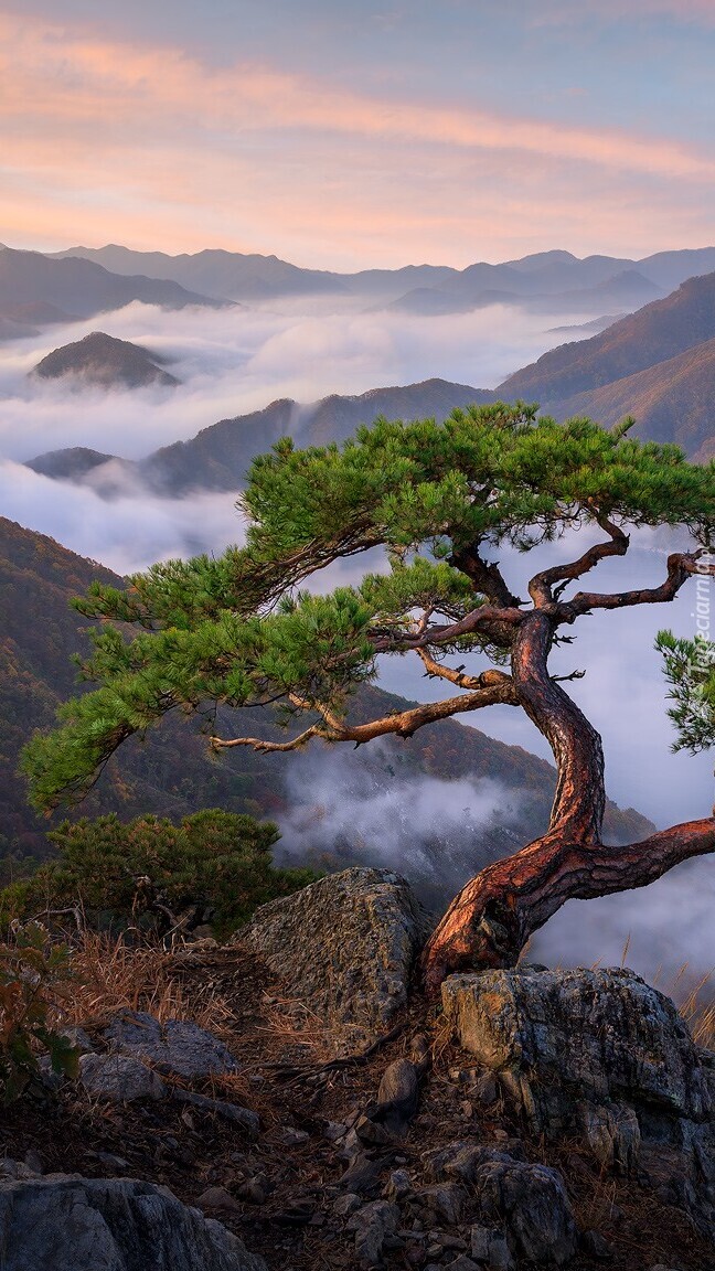 Edytor tapety: Krzywa sosna rosnąca na skale