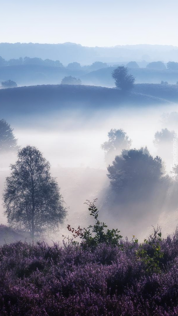Edytor tapety: Drzewa na zamglonym wrzosowisku