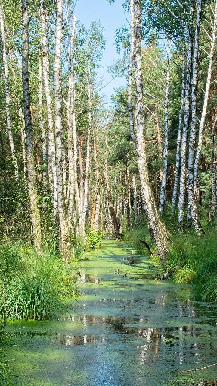Edytor tapety: Brzozy nad leśnym stawem