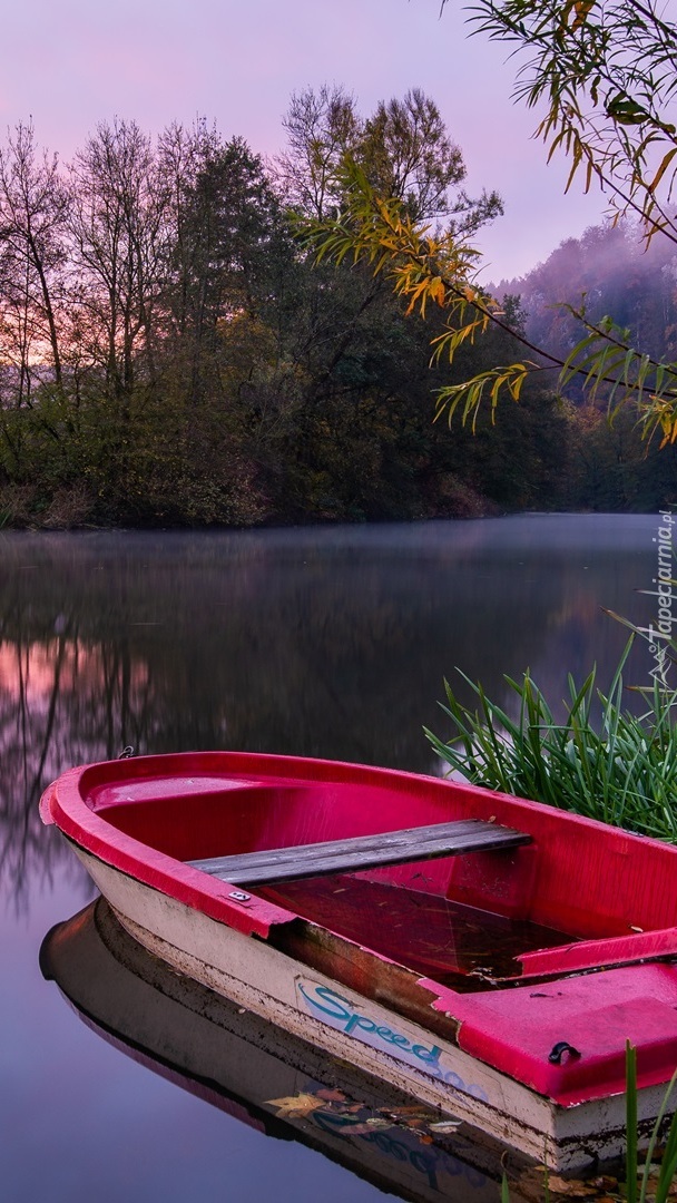 Edytor tapety: Czerwona łódka na brzegu jeziora