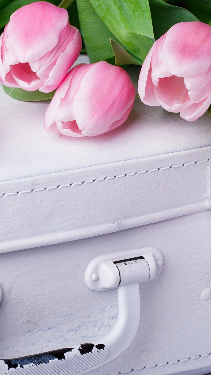 Edytor tapety: Tulipany na białej walizce
