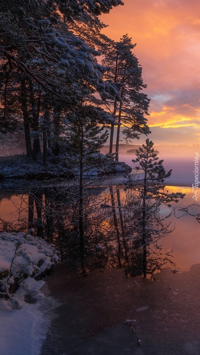 Edytor tapety: Ośnieżone drzewa nad jeziorem
