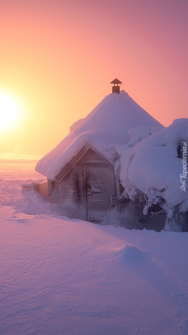 Edytor tapety: Ośnieżona chata o wschodzie słońca
